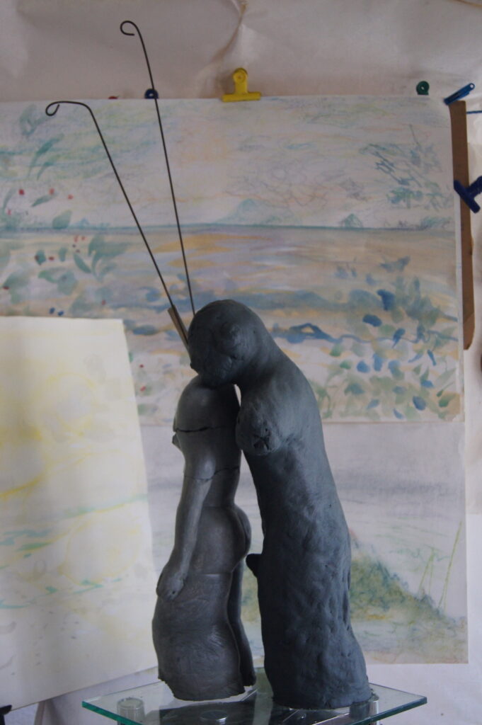 二か月の創作期間を経てイメージを膨らませての選択です、丁寧に打ち削ったHatshepsut とその恋人とのコントラストが偶然美しく感じた。重さ20kg, 高さ93cm, 横23cm, 奥行き27cm, のブロンズクレイの造形作品;、恋に落ちたハプシェプスト